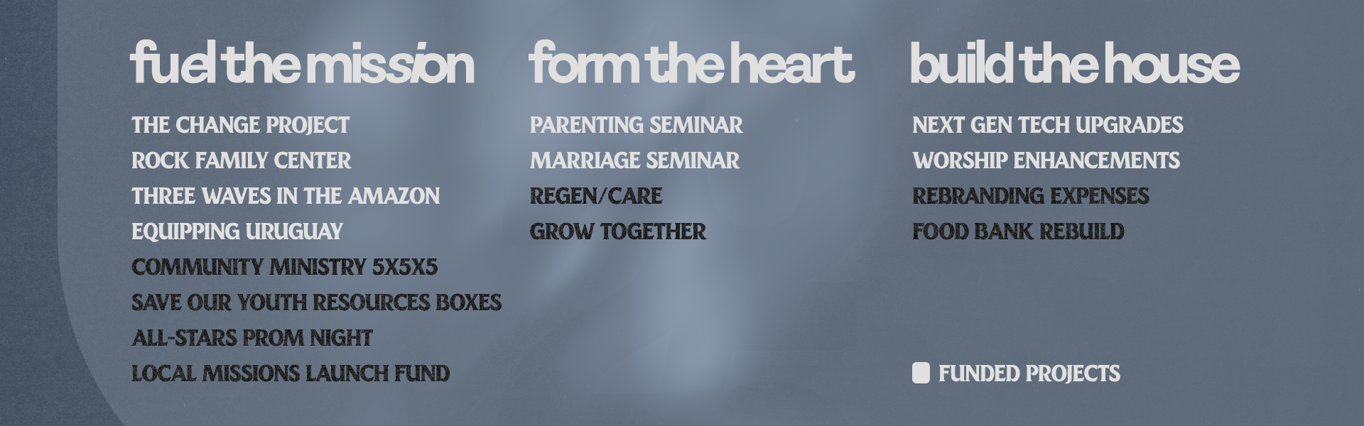 Rebranding Expenses - Our rebrand isn’t about colors or logos—it’s about creating spaces, signage, and materials that reflect who we are becoming as a church. These updates help every guest feel seen, welcomed, and at home the moment they arrive. Together, we’re building environments that embody the warmth and beauty of the gospel.