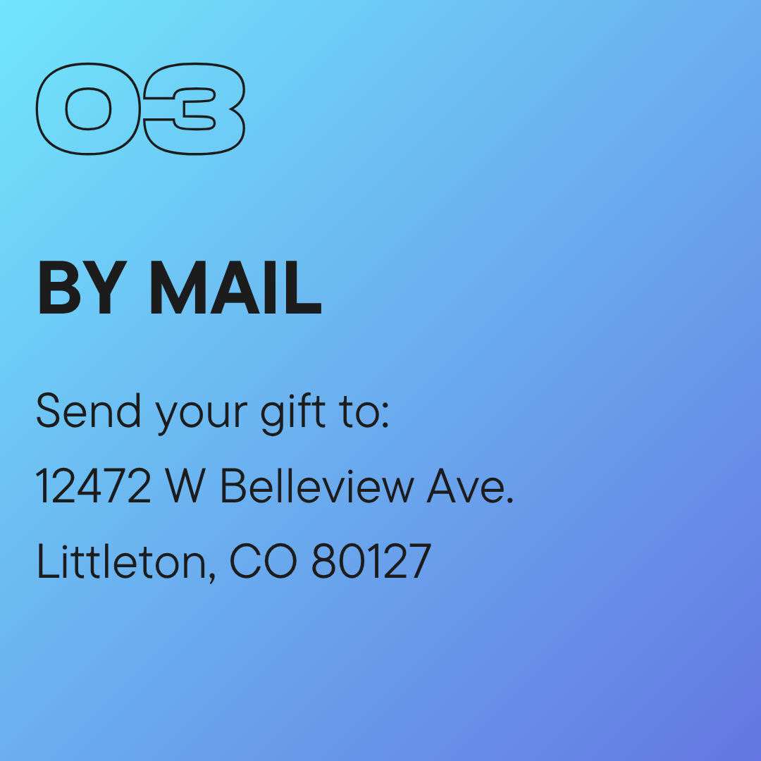 We recommend contacting us before giving securities or real estate to ensure the most effective processing and stewardship. Contact Karen Rock at 303-936-1712 or krock@welcometomosaic.com for assistance.