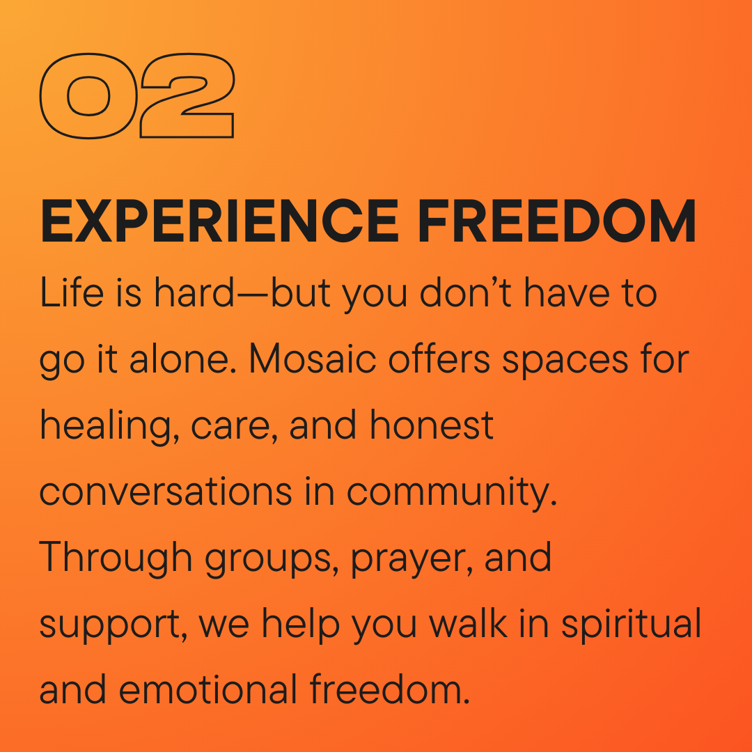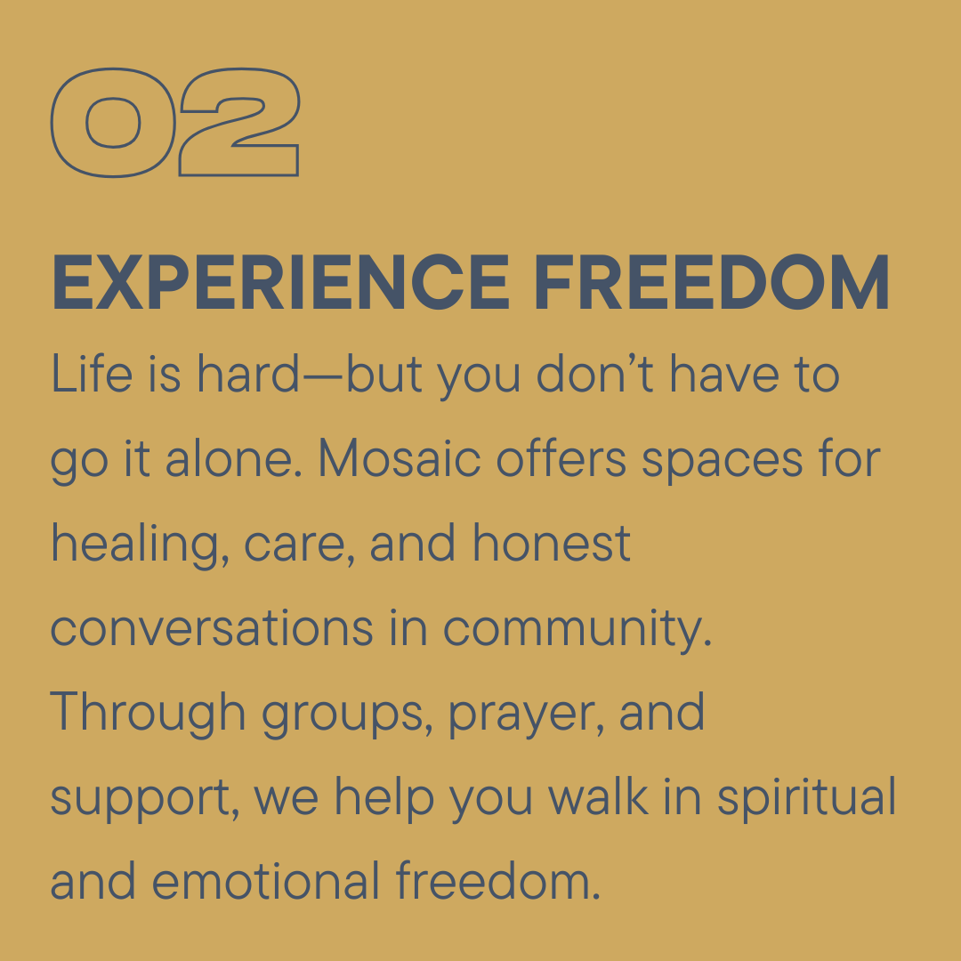 In Jesus, we find healing, purpose, and wholeness. At Mosaic, we’ve walked alongside so many people as they step into a life of renewal and transformation, and we’d love to do the same for you. No matter what your story has been, there is hope and a future ahead. You don’t have to take this journey alone—we’re here to help you take meaningful steps toward being made new. Our heart is to walk alongside you, offering encouragement, guidance, and community as you grow in your faith. Whether it’s finding a group, serving, or simply getting connected, we’re here to help you take meaningful steps forward.